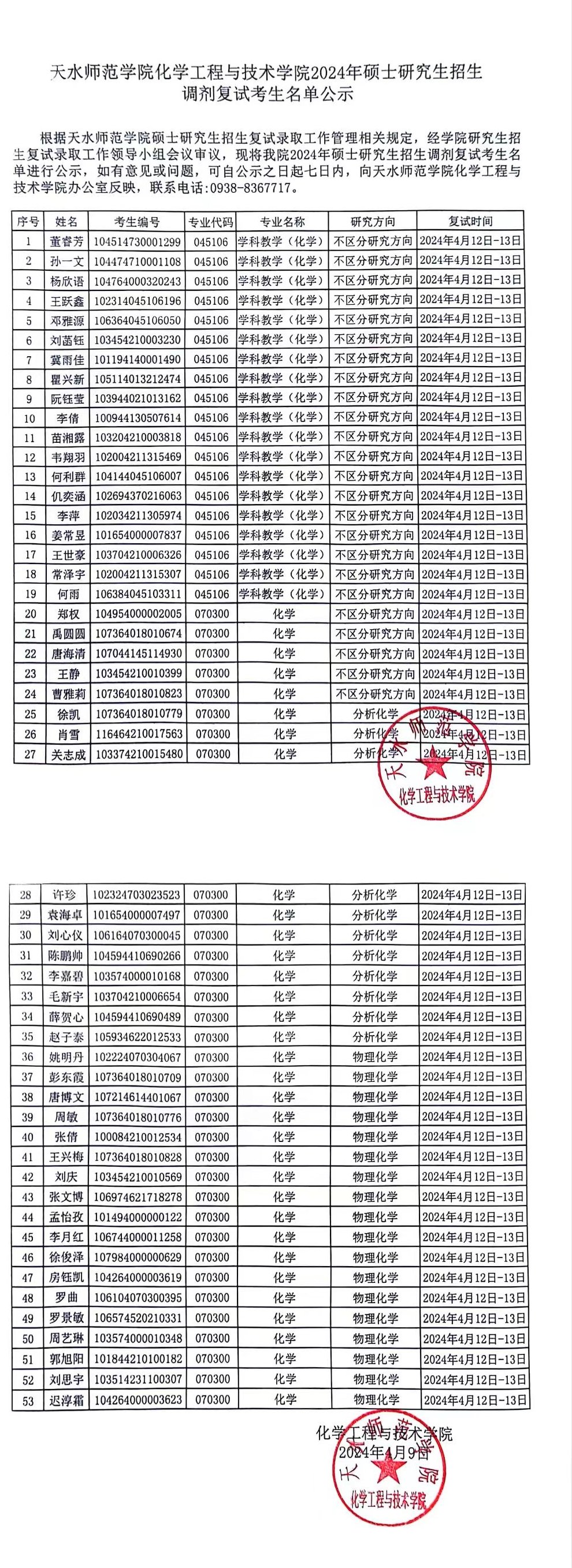 天水师范学院澳门网投官方网站2024年硕士研究生招生调剂复试考生名单公示