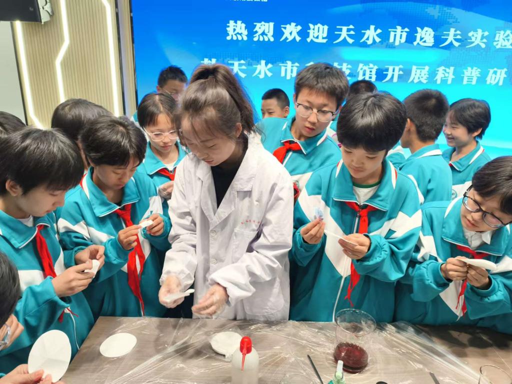 在天水市科技馆钱伟长学术报告厅,化普·智创科普团队为天水市逸夫实验中学分校七年级的师生展示了大象牙膏”“黄金雨”“晴雨花三个趣味化学实验,并指导学生积极参与实验操作。师生们近距离感受了化学的魅力,了解了科学知识,充分激发了学生们科学探索的兴趣,培养了他们的实践创新能力。