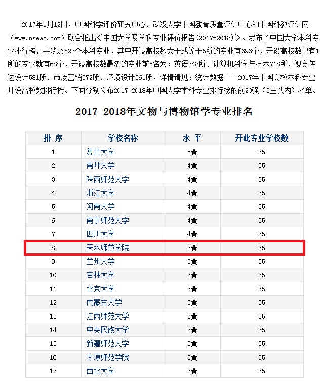 2017年1月12日,中国科学评价研究中心、武汉大学中国教育质量评价中心和中国科教评价网联合推出《中国大学及学科专业评价报告(2017-2018)》,发布了中国大学本科专业排行榜,共涉及523个本科专业。其中,澳门网投澳门网投官方网站的文物与博物馆学专业进入国内前十,排名第八。
