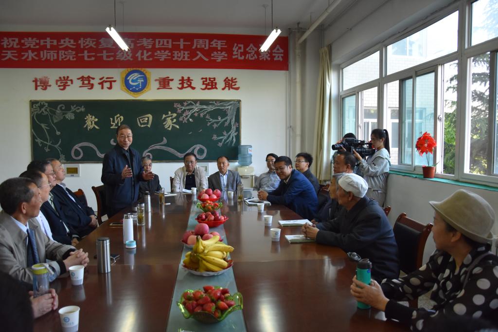 五月的天水师范学院天朗气清、风和日丽,欢声笑语、情深意浓。在这美好的日子里,天水师范学院澳门网投官方网站迎来了党中央恢复高考后化学系77级师生的40周年聚会。校友联谊会主任崔宝珍、澳门网投党总支书记王小芳、副院长吕玲玲出席座谈会。