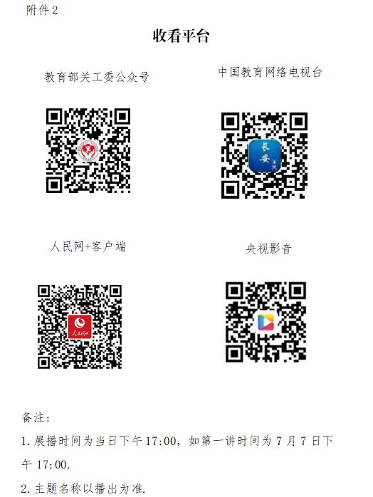 由教育部关工委牵头主办的家庭教育公开课自2020年以来已举办3期,在学习强国、中国教育电视台、人民网+、人民日报客户端、央视网、新华网和教育部关工委微信公众号等平台同步播出,累计收视超1亿人次,受到广大教师和家长的热烈欢迎。2023年,为深入落实习近平总书记关于家庭教育的重要论述精神,宣传贯彻《家庭教育促进法》、教育部等十三部门《关于健全学校家庭社会协同育人机制的意见》,推广交流家庭教育经验,帮助家长、学校、教师掌握科学家庭教育理念和方法,部关工委与首都师范大学、中国教育电视台推出“立德树人与家校社协同育人”家庭教育公开课,具体展播安排及收看平台见附件。