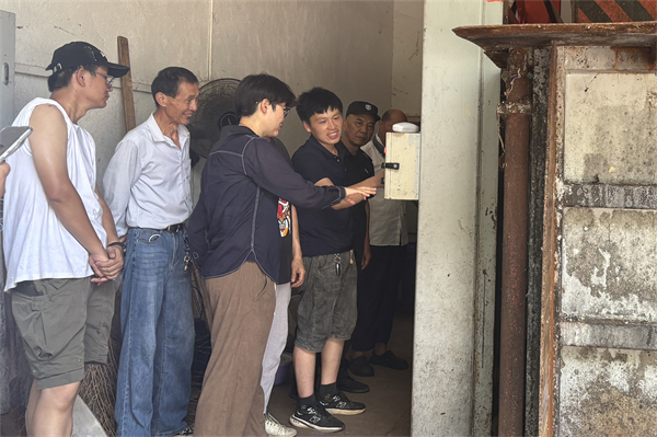 王明明(左三)组织新员工学习垃圾压缩站操作流程。