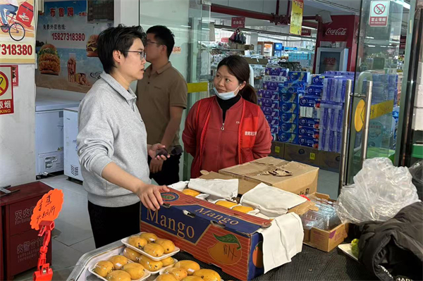 王明明(左一)在校内商铺开展安全检查。
