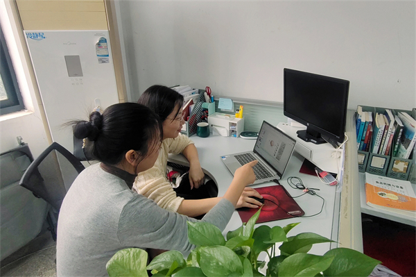 范露(右一)在教学实训环节指导学生开发产品。