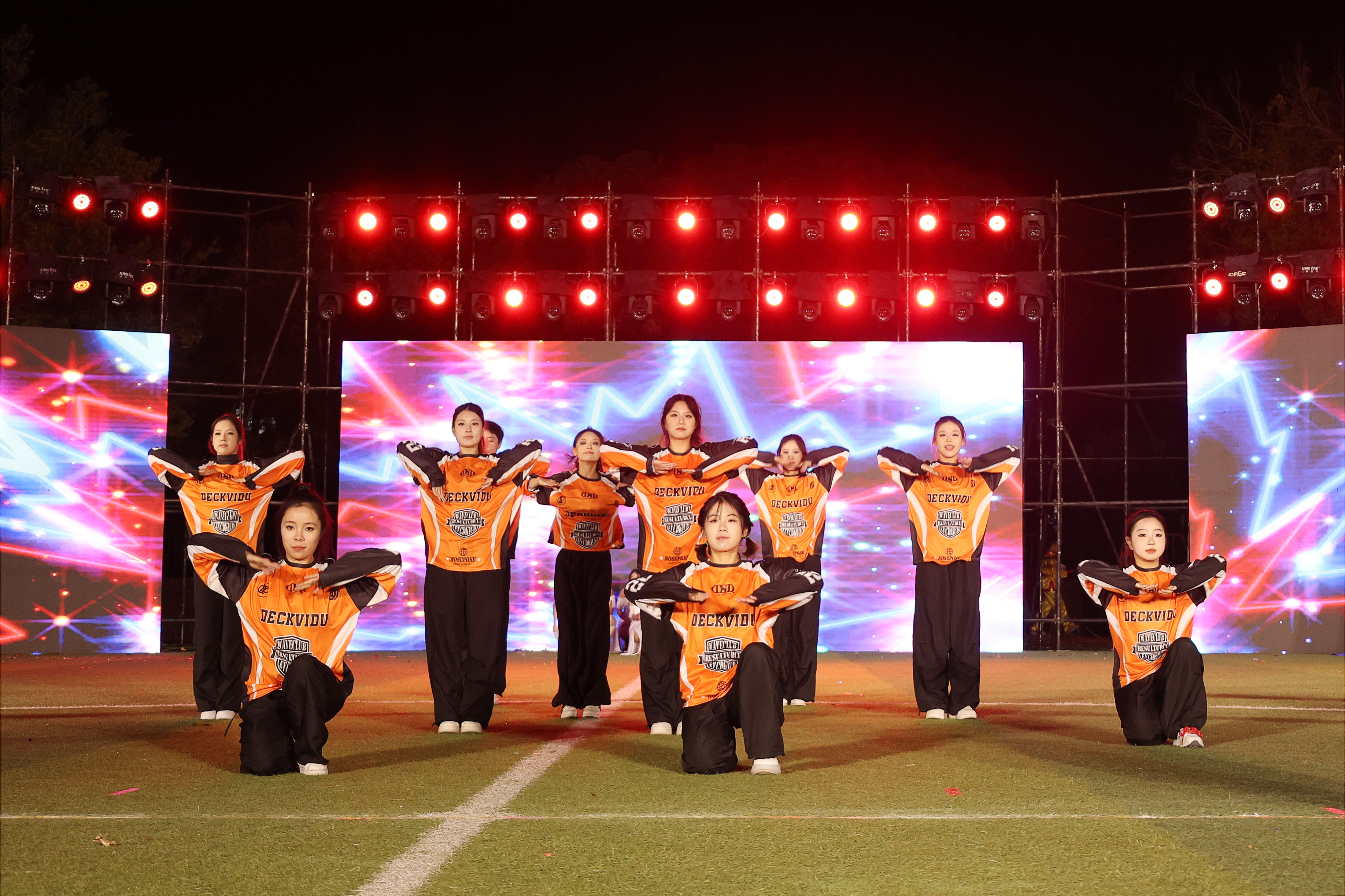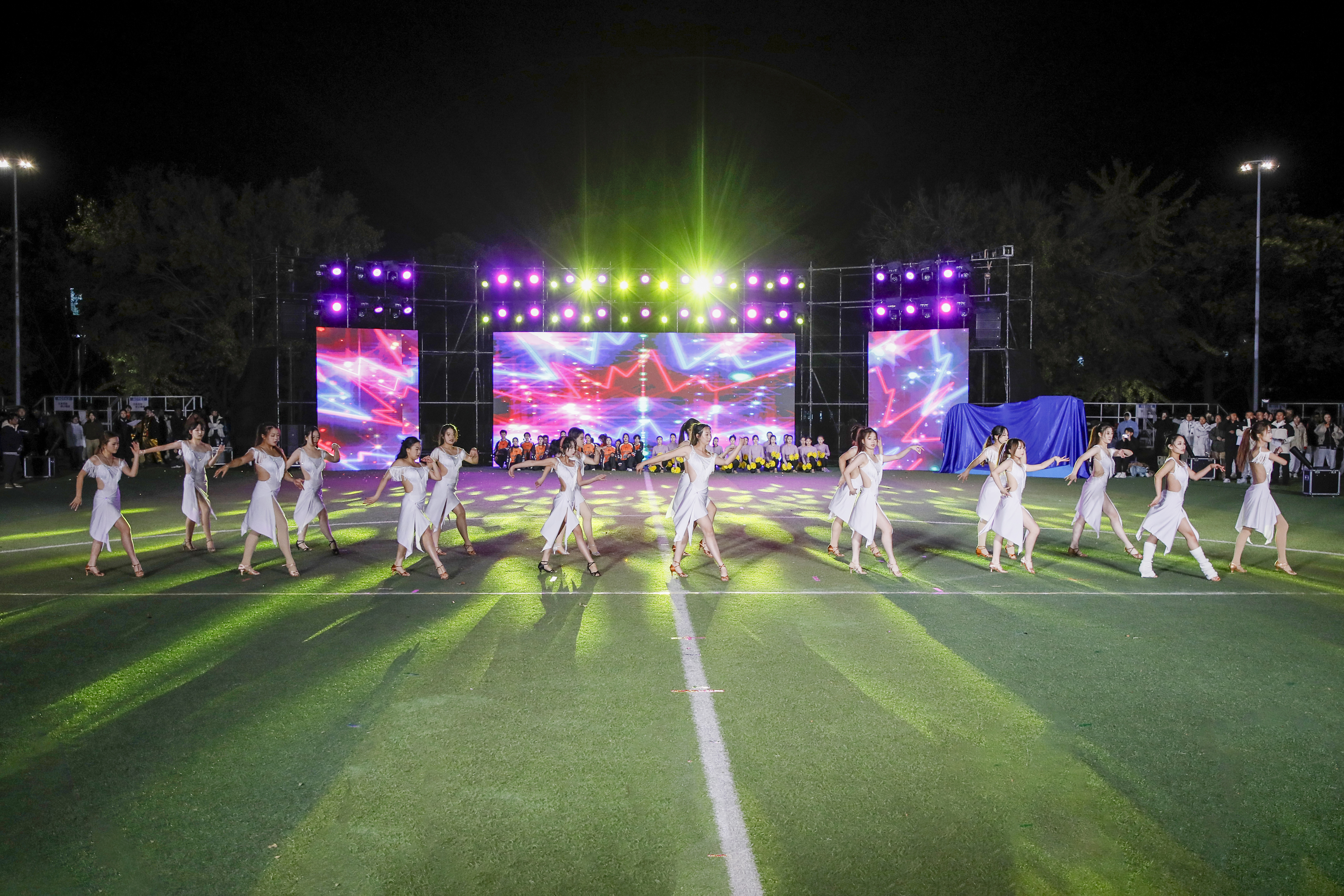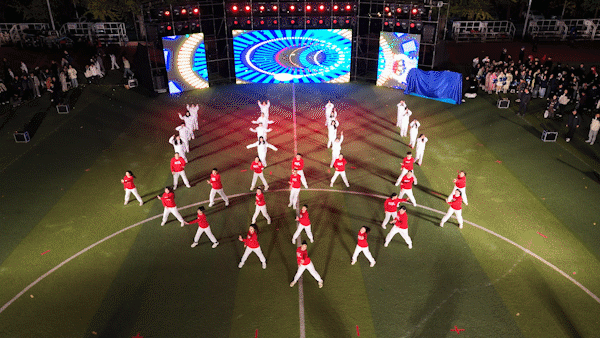 聚光灯下,“橙色活力迸发、白色优雅律动、红色热情似火”校舞蹈队、啦啦操队、体育舞蹈队轮番上场,共同演绎《三舞同心》,在夜幕中共同谱写青春与活力的交响乐章。