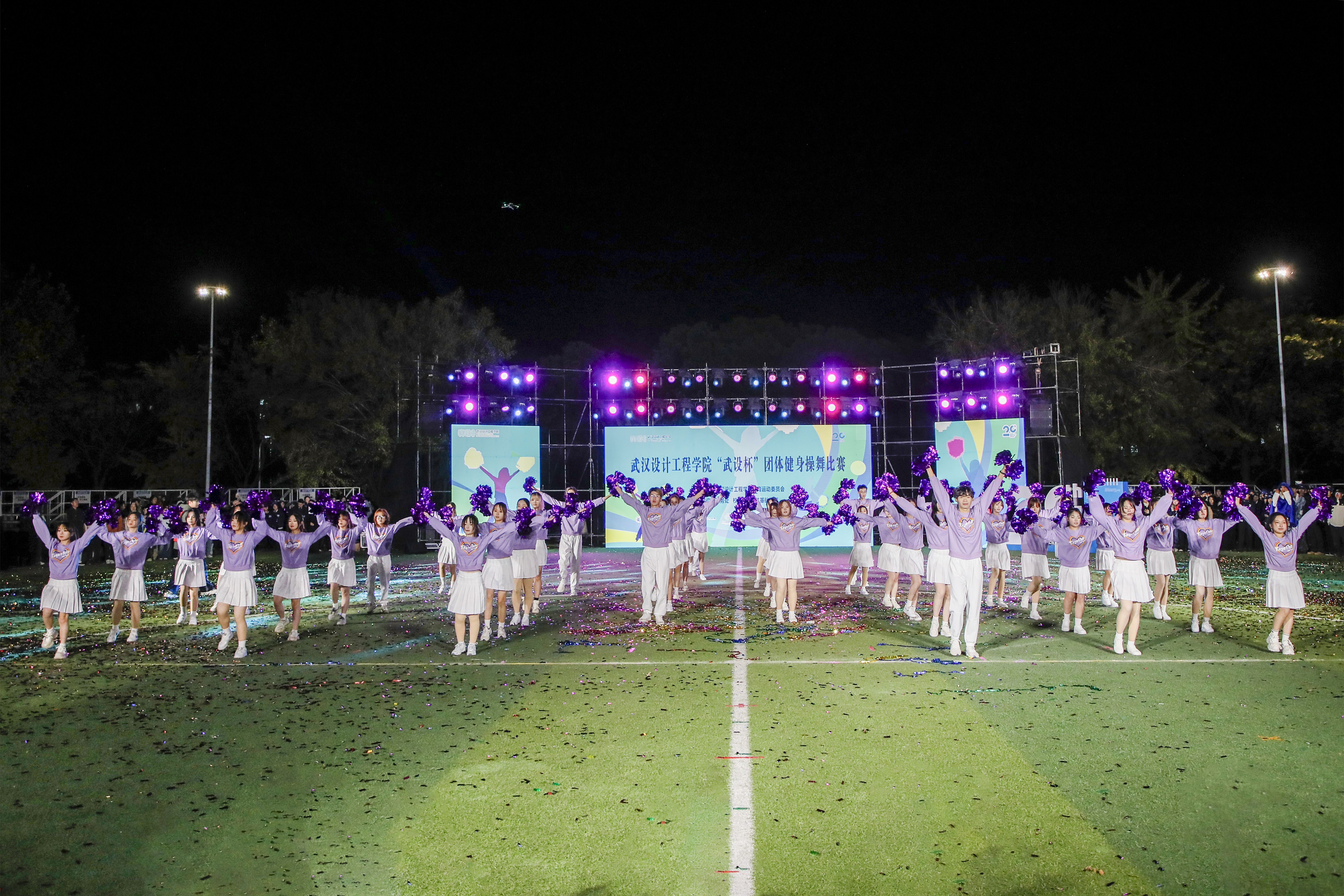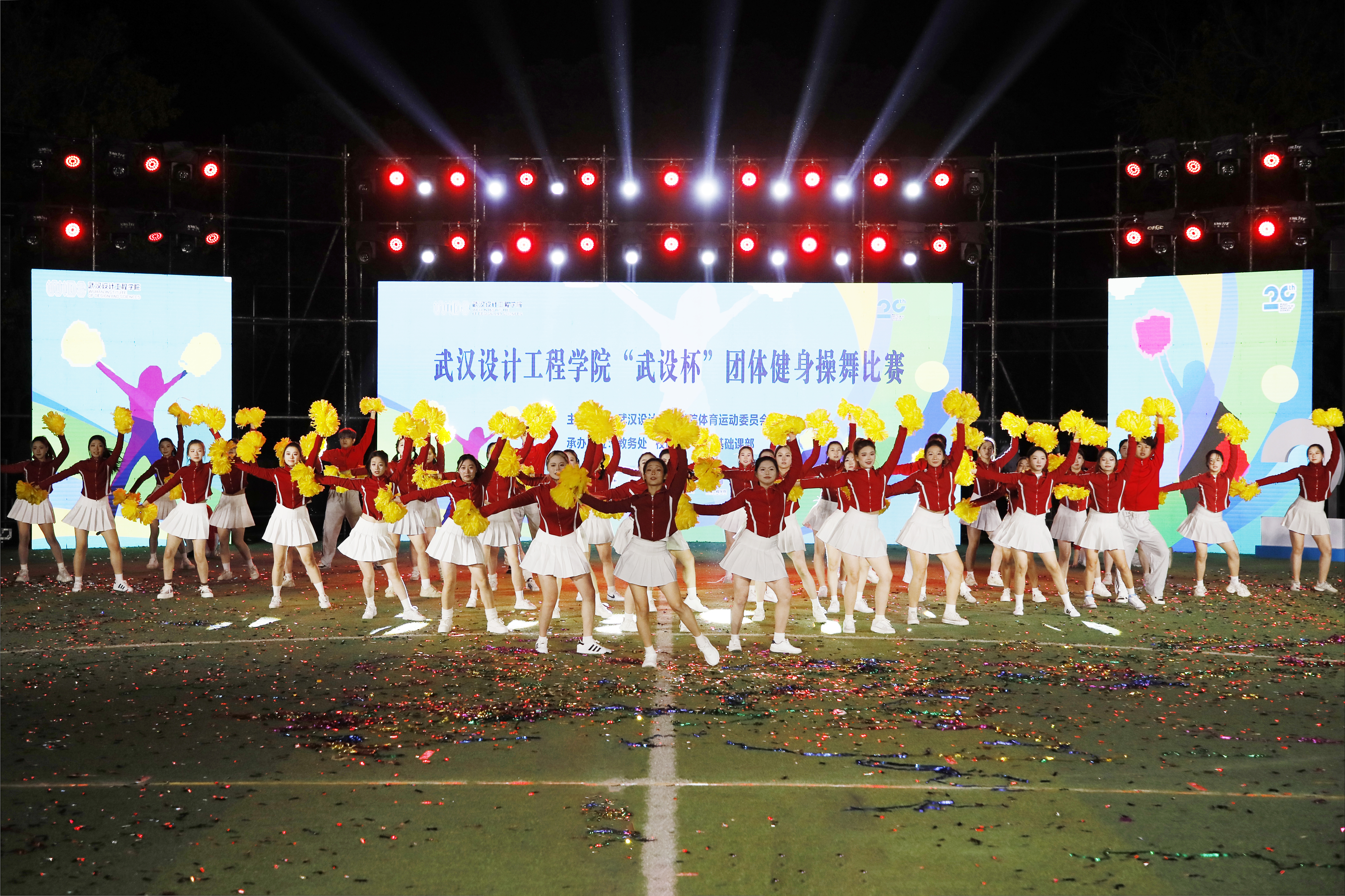 在缤纷飞舞的彩带辉映下,来自各学院的七支健身操舞队依次惊艳登台。他们以特色表演与精心设计的横幅展板,深情传递对学校的诚挚祝福,为建校二十周年献礼。现场气氛炽热,尽显团结奋进之姿。