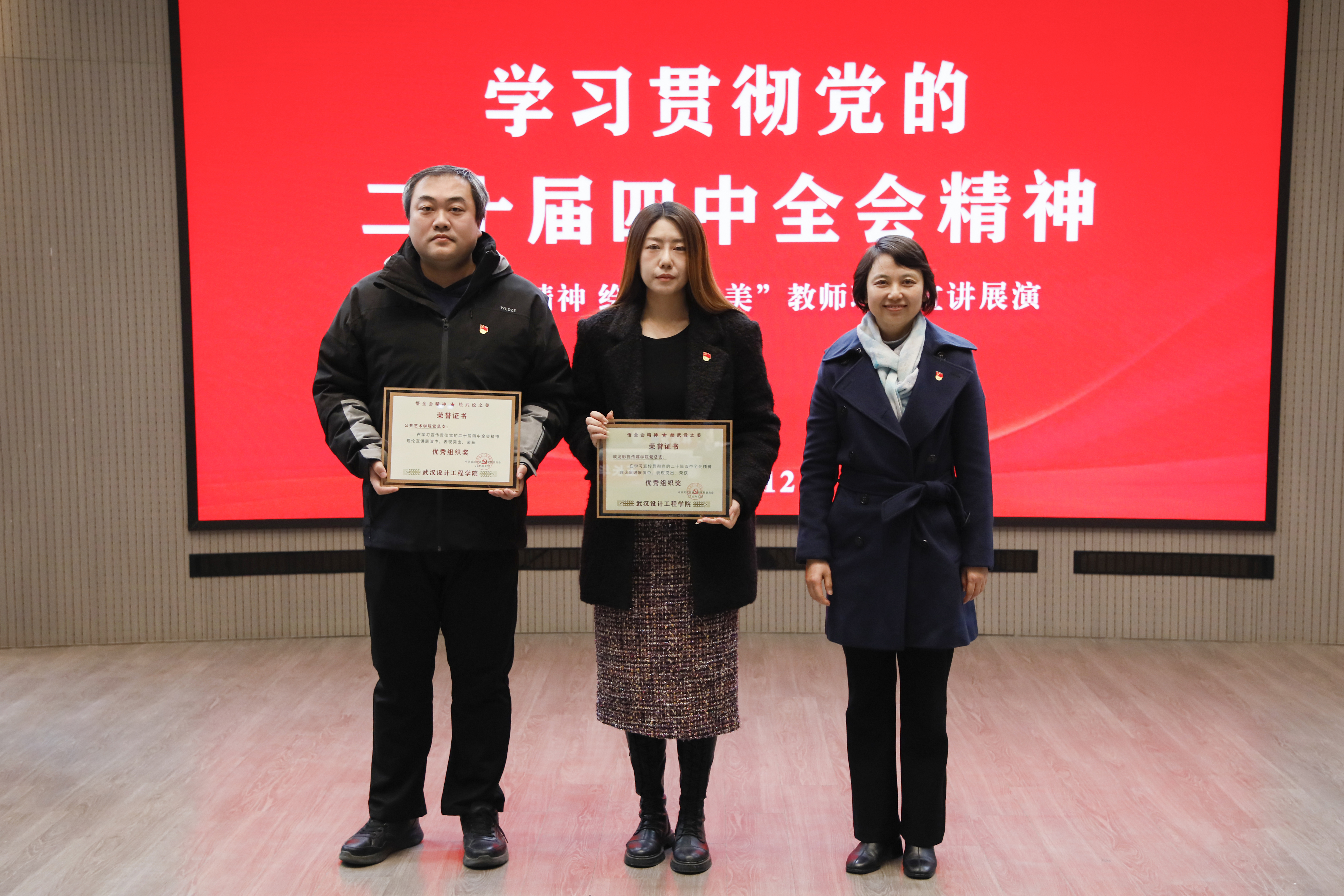 展演结束后,与会领导嘉宾为宣讲团学生成员代表和全体教师成员颁发了宣讲团聘书,其中7位教师获评“最佳宣讲员奖”,成龙影视传媒学院党总支、公共艺术学院党总支荣获“优秀组织单位”奖。