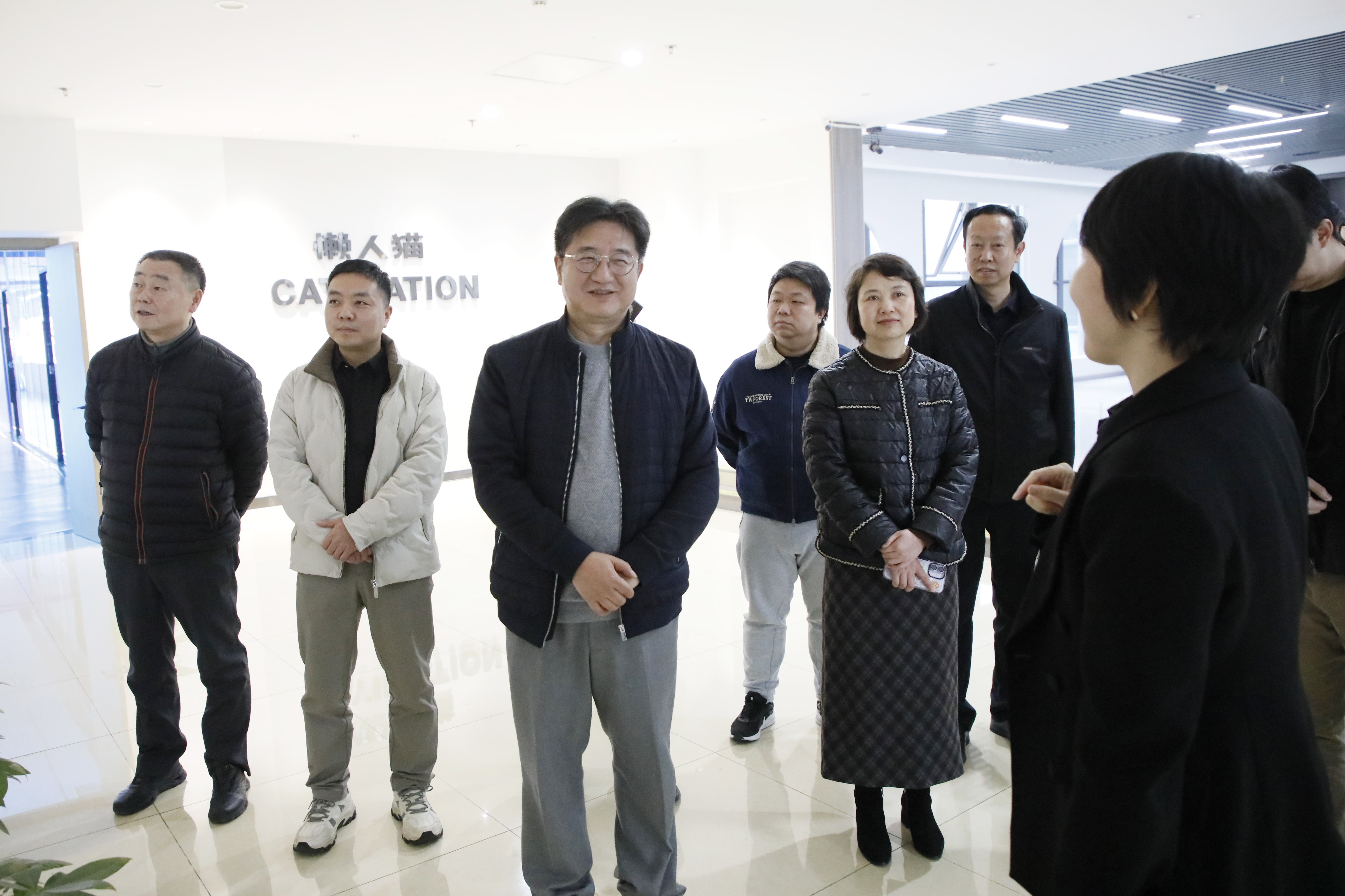 在胡感华等人的陪同下,校领导一行参观了懒人猫公司的成果展示区及办公环境,深入了解了公司在虚拟现实、数字文娱等领域的技术创新、核心产品及企业文化。