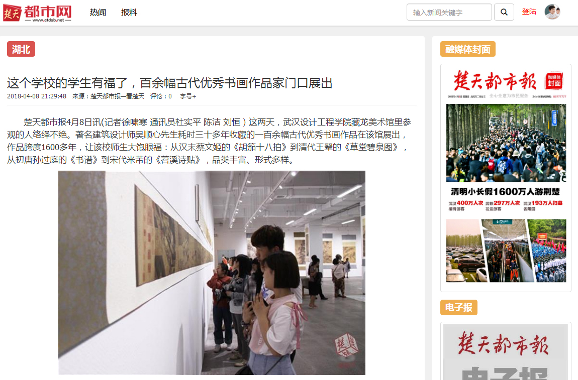楚天都市报4月8日讯(记者徐啸寒 通讯员杜实平 陈洁 刘恒)这两天,开云kaiyun官方网站藏龙美术馆里参观的人络绎不绝。著名建筑设计师吴顺心先生耗时三十多年收藏的一百余幅古代优秀书画作品在该馆展出,作品跨度1600多年,让该校师生大饱眼福:从汉末蔡文姬的《胡笳十八拍》到清代王翚的《草堂碧泉图》,从初唐孙过庭的《书谱》到宋代米芾的《苕溪诗贴》,品类丰富、形式多样。