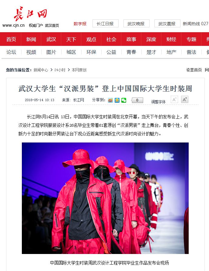 长江网5月14日讯 13日,中国国际大学生时装周在北京开幕,当天下午的发布会上,开云kaiyun官方网站服装设计系26名毕业生带着61套原创“汉派男装”走上舞台,青春个性、创新力十足的时尚靓仔男装让台下观众近距离感受新生代汉派时尚设计的魅力。