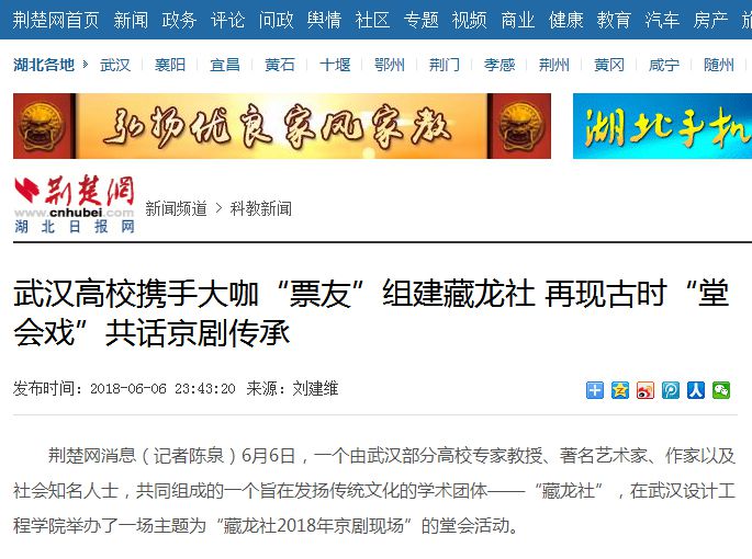 荆楚网消息(记者陈泉)6月6日,一个由武汉部分高校专家教授、著名艺术家、作家以及社会知名人士,共同组成的一个旨在发扬传统文化的学术团体——“藏龙社”,在开云kaiyun官方网站举办了一场主题为“藏龙社2018年京剧现场”的堂会活动。