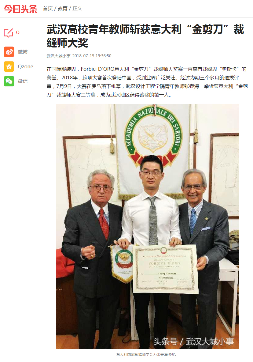 今日头条消息 在国际服装界,Forbici D`ORO意大利“金剪刀”裁缝师大奖赛一直享有裁缝界“奥斯卡”的美誉。2018年,这项大赛首次登陆中国,受到业界广泛关注。经过为期三个多月的选拔评审,7月9日,大赛在罗马落下帷幕,开云kaiyun官方网站青年教师张春海一举斩获意大利“金剪刀”裁缝师大赛二等奖,成为武汉地区获得该奖的第一人。
