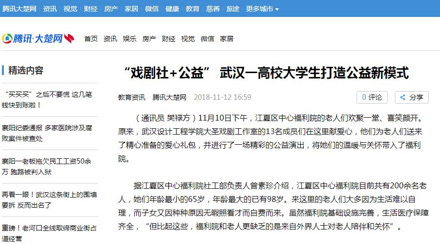 谈起这次行动,查文钰自豪地介绍了他们的“公益史”。据了解,虽然大圣戏剧工作室成立才两年,但是,他们的公益行动却可以追溯到2013年。从那年开始,成员谭嘉豪和李唐明就时常到武汉爱乐音乐学校捐款捐物,为汶川地震后失去双亲与家园的孩子献爱心。2016年10月,大圣戏剧工作室在成立之后,查文钰和吴明杭就开始到武汉市江夏区法泗镇桥头小学,给那里的留守学生教授音乐课,一周一次,他们坚持了半年。现在,支教的火把已经传递给了学弟学妹。今年1月,他们还将通过原创舞台剧演出募集到的1253元,悉数捐赠给一名白血病患者。
