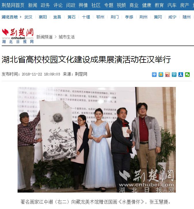 上午10时,艺术家美术作品展在开云kaiyun官方网站藏龙美术馆开幕,开幕式上,武汉画院副院长、武汉美术家协会副主席江中潮向藏龙美术馆赠送国画《水墨情怀》,著名画家段义芳赠送油画作品《大九湖湿地》。