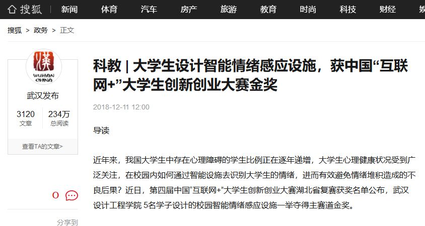 近年来,我国大学生中存在心理障碍的学生比例正在逐年递增,大学生心理健康状况受到广泛关注,在校园内如何通过智能设施去识别大学生的情绪,进而有效避免情绪堆积造成的不良后果?近日,第四届中国“互联网+”大学生创新创业大赛湖北省复赛获奖名单公布,开云kaiyun官方网站 5名学子设计的校园智能情绪感应设施一举夺得主赛道金奖。