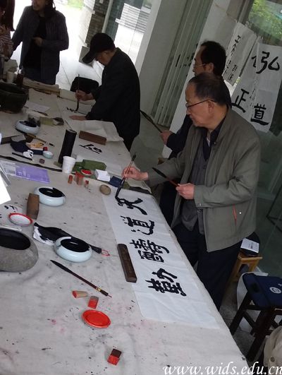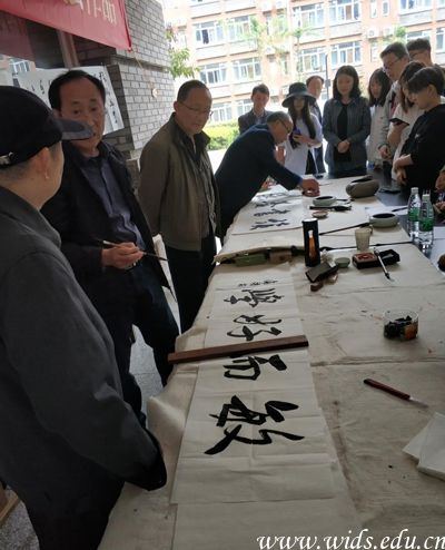 上午9时许,四位书法家现场展纸而书、挥毫而就,内容包括“劝学”“励志”“寄情”“追古”等,行、草、隶、篆等书体应有尽有。活动吸引了数百名师生前来场观摩,现场人文气息浓厚。